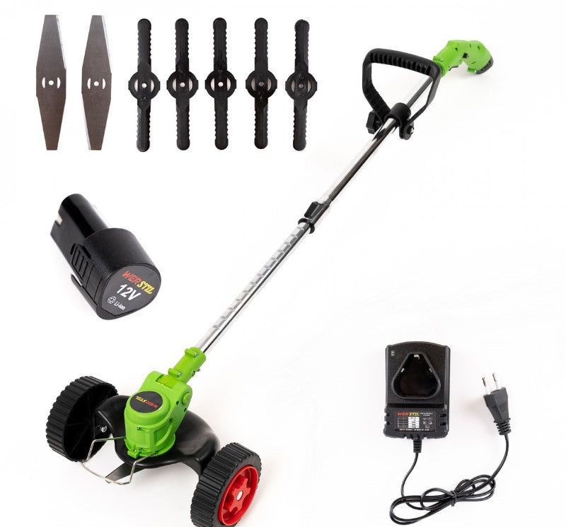 Motocoasa 2 in 1 WerSTIL, 2 acumulatori 12V, cu roti, 7 lame incluse